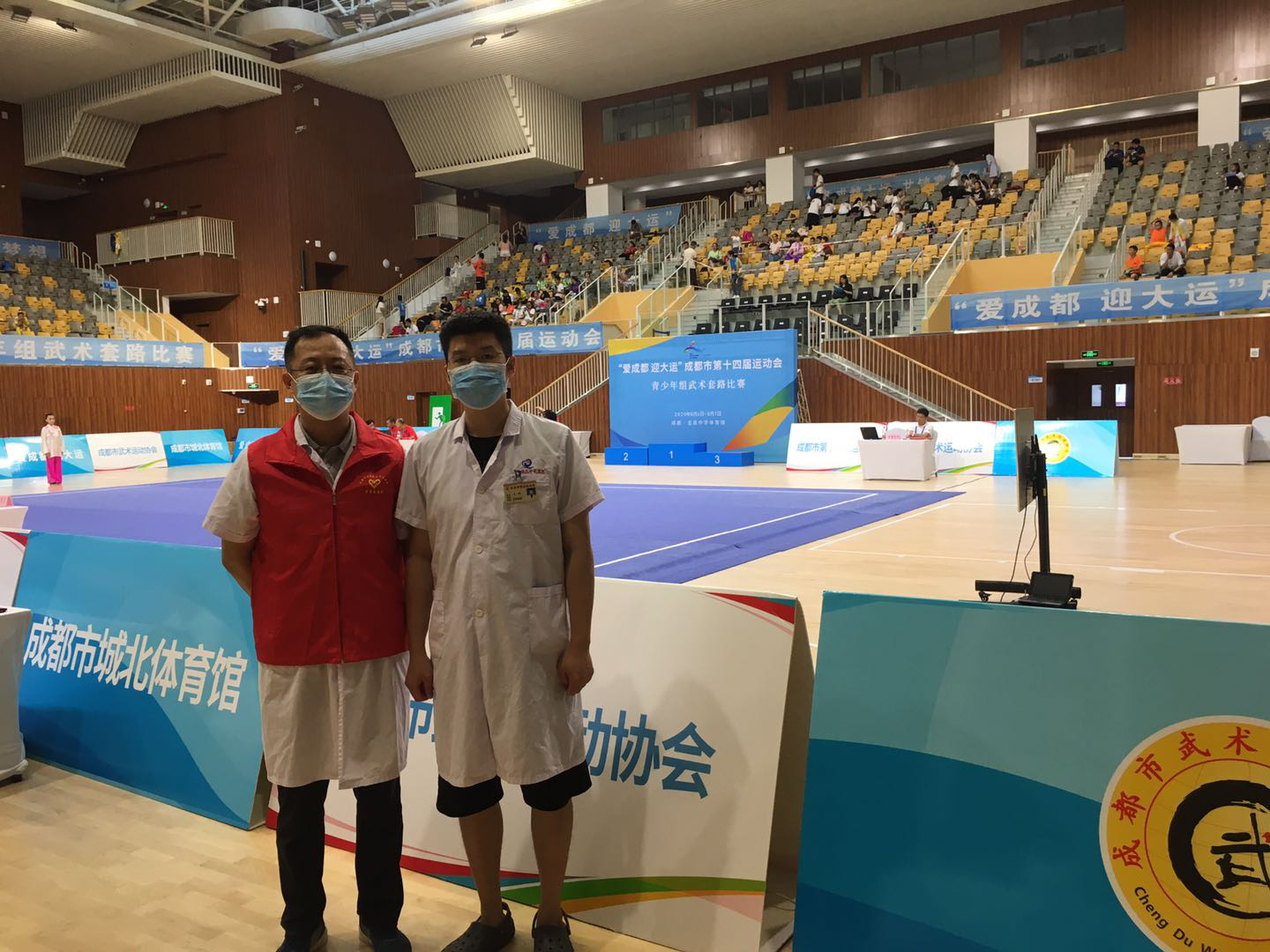 2020年8月5日下午5点过,龙泉驿区中医医院接到卫健局紧急通知:2020年8月6日-7日上午8:00-20:00为市运会武术套路比赛活动提供医疗保障。因为已经是下班时间医务科急忙到楼下的骨科“抓壮丁”。骨科的党员同志刘志强主任医师,王翔和马轩医师刚下手术还没来得及下班,听到通知立马主动请缨,承接了连续两天的医疗救护活动。其他党员同志也积极响应。