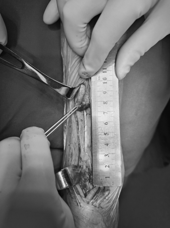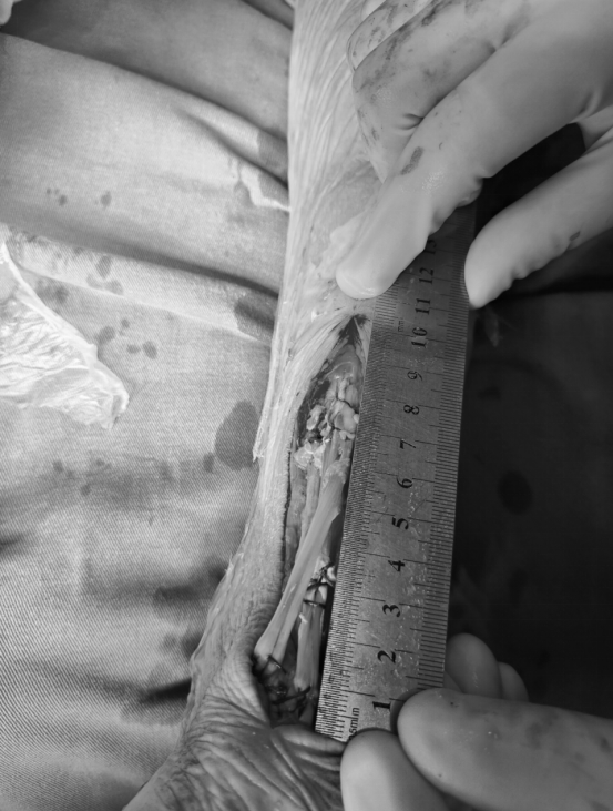 为了尽量规避以上问题,骨伤中心副主任许锦涛决定采用目前较有优势的微创切取全长踇(拇)长屈肌腱重建陈旧性跟腱断裂术。