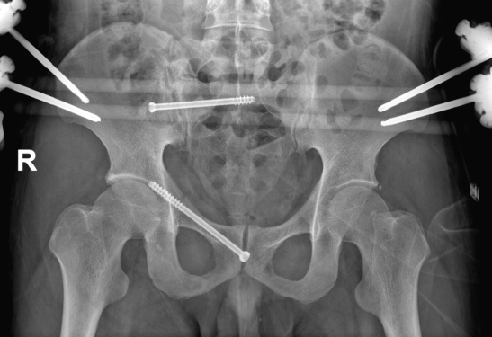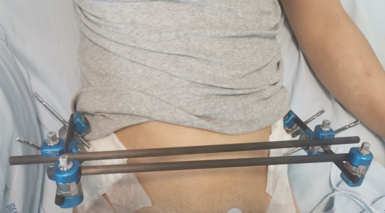 患者右侧骶骨骨折+右侧耻骨上下支骨折,已经影响到骨盆环的稳定。经骨伤科主任张成勇、副主任许锦涛团队通过充分讨论后,决定为其在全麻下,行骨盆骨折前环逆行耻骨螺钉内固定+外固定架、骨盆骨折后环骶髂关节螺钉内固定术,征询患者及家属同意后,在西部战区总医院骨科廖冬发教授的指导下,顺利完成手术。