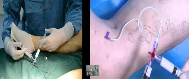 将液体或者泡沫硬化剂注入曲张静脉,破坏静脉内皮细胞,从而使曲张静脉萎缩。