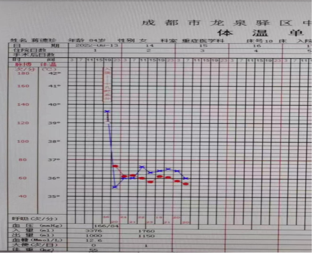 8月13日,我院重症医学科收治一名高龄热射病患者;患者女,84岁,因高温天气外出时晕倒,昏迷不醒,送入我院重症医学科时测得体温41.5℃,全身皮肤灼热,触之滚烫,患者既往身体状况可,考虑为热射病。