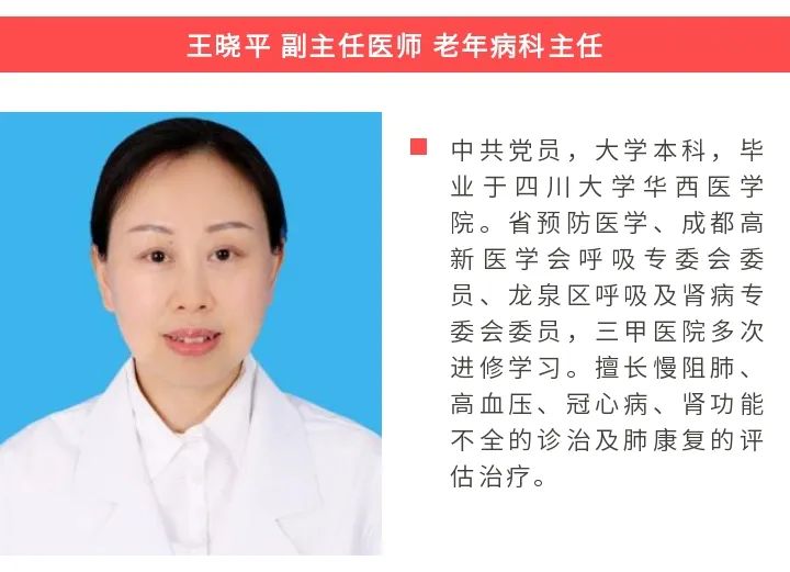 老年病科设置专科门诊 1 个,综合治疗室 1 个,病床 50 张。现有副主任医师 2 名,主治医师 1 名,住院医师 6 人,其中研究生 5 名;主管护师 5 人,护师 10 人,护士 1 人。拥有2名省市级专委会委员,多名呼吸专科、肾内专科及肿瘤专科医生及中西医结合研究生,形成了一支老中青结合、中西医结合的高水平学术医疗队伍。科室长期与成都医学院附属医院、四川省人民医院、中国人民解放军成都军区总医院等交流合作 。科室配置:奥林巴斯电子支气管镜、耶格肺功能检测仪、飞利浦V60无创呼吸机、瑞思迈无创呼吸机、飞利浦便携式睡眠监测仪、中频治疗仪、排痰仪、离子导入治疗仪、疼痛治疗仪、24小时动态血压检测仪、迈瑞心电监护仪、心脏除颤监护仪等先进的诊治设备及抢救设施,为患者疾病诊治提供有力依据和支持。业务能力:擅长治疗呼吸系统疾病(慢性阻塞性肺疾病、慢性肺源性心脏病、急慢性支气管炎、支气管哮喘、支气管扩张、肺炎、咯血、心衰呼衰等)和急慢性肾炎、肾功能不全、慢性肿瘤、糖尿病等中西医结合治疗。开展电子支气管镜检查及治疗技术、肺功能检测、无创呼吸支持治疗、便携性睡眠呼吸检测、心肺功能康复治疗及穴位贴敷、耳针、灸法、中药熏洗、中药塌渍、中药涂擦、穴位注射等中医特色治疗。