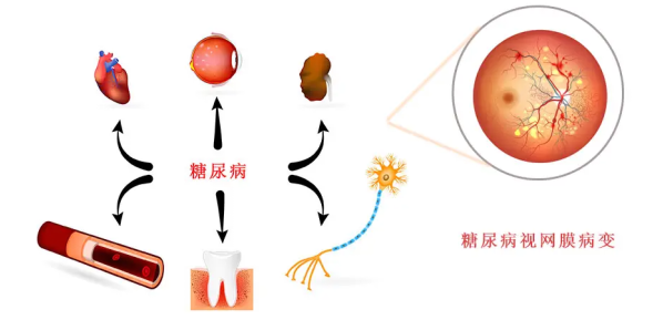 糖尿病会累及全身所有血管,造成病变。在早期阶段,视网膜内的微小血管会出现阻塞,引起血管渗漏或视网膜出血,之后视网膜会代偿性产生异常的新生血管,而这些新生血管会更容易发生渗漏或出血,导致糖尿病患者视力下降,甚至失明。糖尿病性视网膜病变早期通常没有任何症状,所以很容易被患者混淆为白内障、青光眼等,如果不及时进行检查和治疗,随着病情的进展,会出现一系列严重问题。