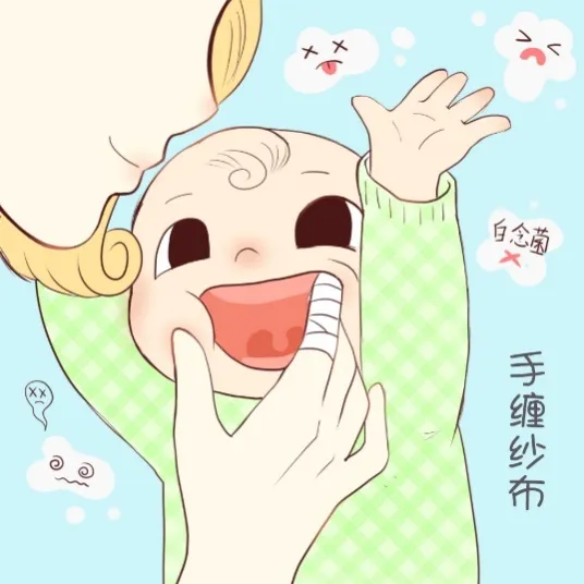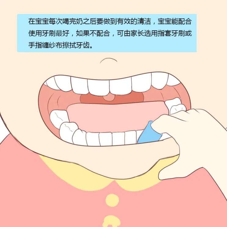 一年之计在于春,一生之计在于幼,从宝宝出生那一刻起,家长就应该帮助他们培养良好的口腔卫生习惯,每天给宝宝口腔做清洁。而且在宝宝四个月左右时,会通过牙床和舌头的触感获得相关信息传递给大脑,认识这个世界,帮助生长发育。宝宝通过口腔了解外界事物,同时也会有细菌跟着进入宝宝的口腔,所以一定要清洁好宝宝的口腔。宝宝出生之后,即使一颗牙齿没有,家长也应该每天一次用软纱布擦洗口腔,这是一种有益的亲子互动方式,也有助于婴幼儿在早期养成清洁口腔的好习惯。对于没长牙的宝宝,最简单的方法就是清洁手指后包绕干净柔软的棉纱或用棉签,蘸温水轻拭宝宝的牙床和腭部,注意一定要轻,因为宝宝的牙床要比大人的娇嫩许多,每天至少清洁一次(图1),养成清洁习惯的宝宝,未来更不容易排斥刷牙,家长也能及时发现嘴里的新情况。具体步骤包括:预备纱布、棉签及一杯温白开水,彻底洗净双手,用纱布缠绕手指,蘸些白开水,轻轻放进宝宝嘴里,转圈轻柔擦拭干净宝宝的牙床。