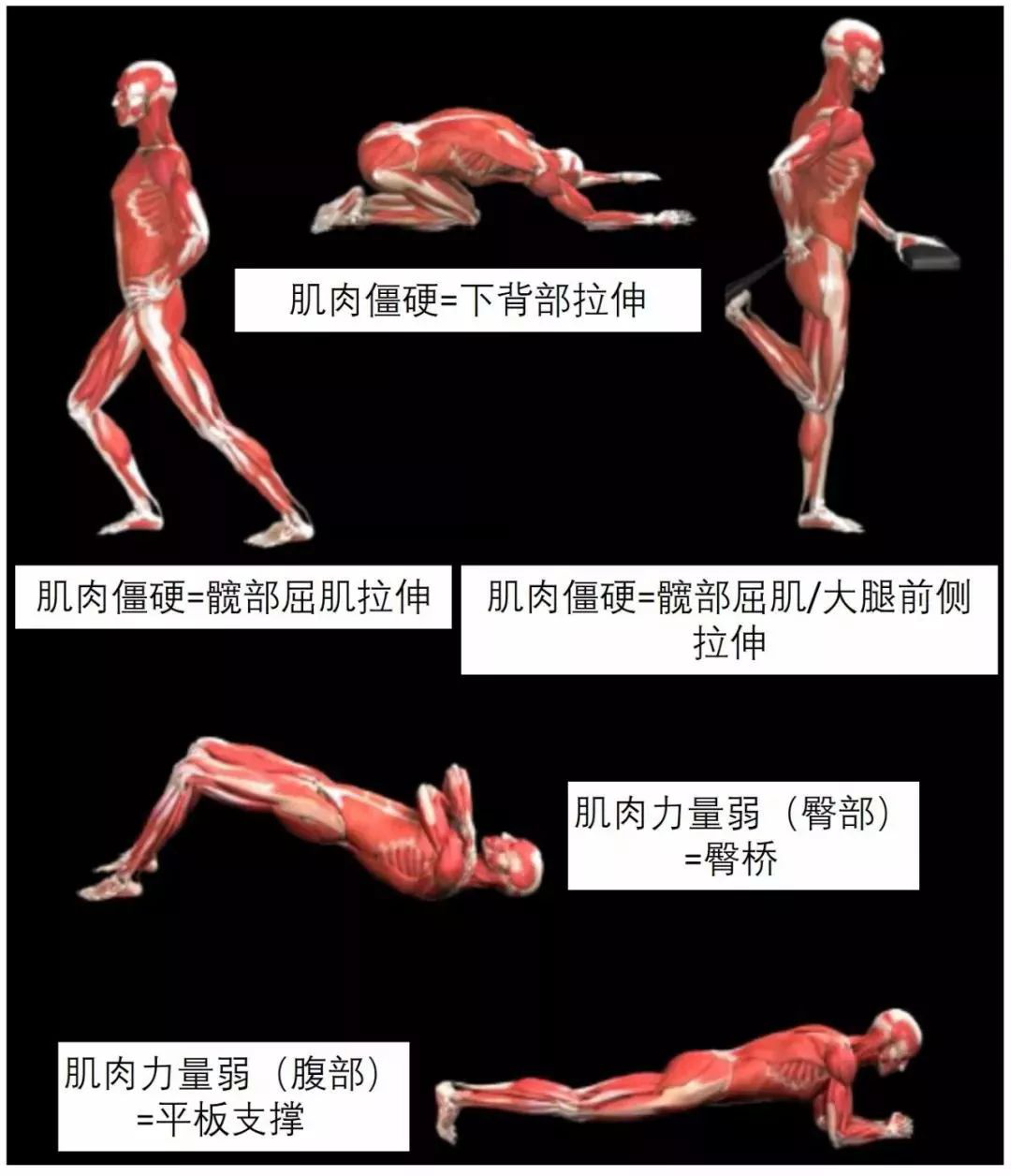 对于过紧/僵硬的肌群,进行拉伸:髋部屈肌、下背部肌群;对于力量过弱的肌群,进行相关的力量训练,强化腹部、臀部、大腿后侧肌群。