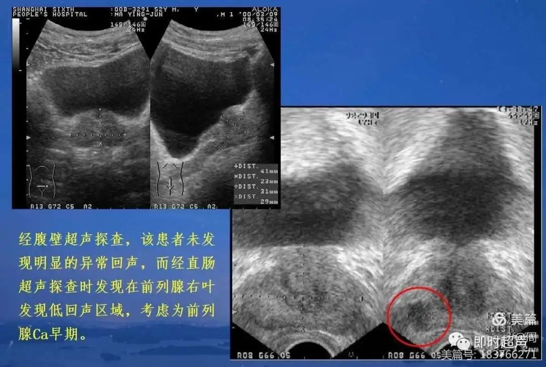 经直肠前列腺超声检查,是将腔内高频探头伸入直肠,近距离观察前列腺及周围结构。对于前列腺癌的早期诊断,具有重要的临床价值,目前认为经直肠检查法是前列腺的标准超声检查法。