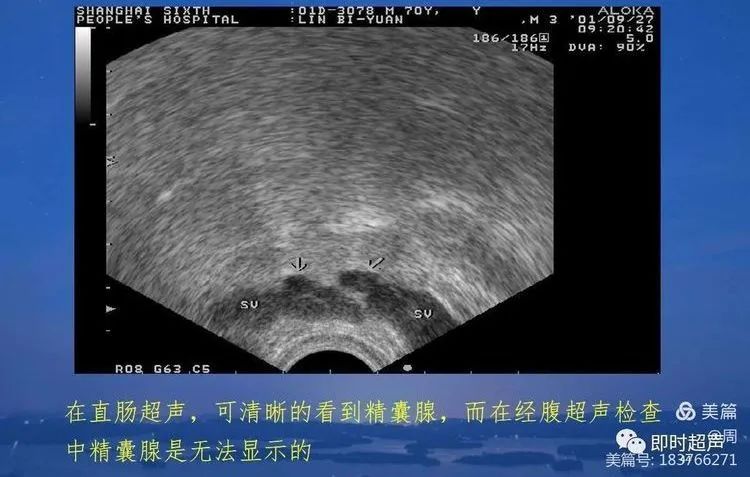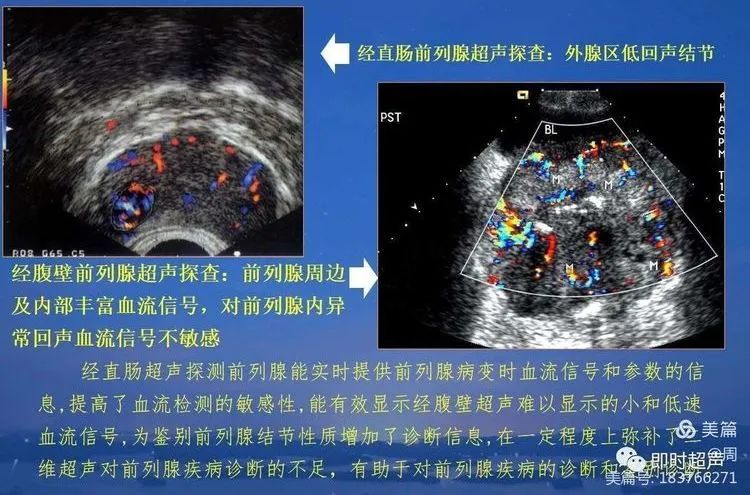 1. 经直肠彩色多普勒超声获得比经腹超声检查更清晰的前列腺内部结构图像,便于对前列腺、精囊腺及周围结构进行更细致的检查。能精确测量前列腺体积,显示前列腺内部细微病变,尤其是异常回声结节的检出率高,彩色多普勒超声不仅可提示异常回声结节的血流情况,还可发现二维超声难以发现的异常血流增加区域,为临床提供了丰富的影像学信息,有助于前列腺疾病的诊断和鉴别诊断。