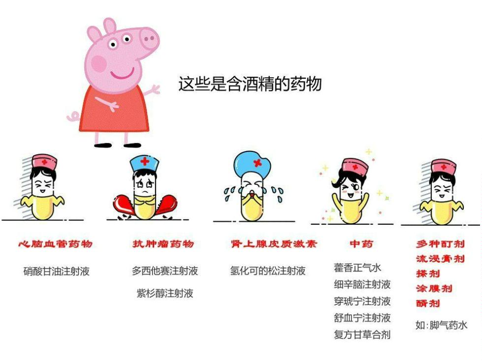 最常见的含有乙醇的食品为白酒、啤酒、红酒、米酒等酒制品;含有乙醇的食物有酒心巧克力、醉蟹等添加酒精辅料的食物;含有乙醇的药物:复方甘草液、藿香正气水、氢化可的松注射液、细辛脑注射液、尼莫地平注射液、伏立康唑冻干粉、血栓通注射液等,所以临床一线工作者应注意含有乙醇的食品及药品,避免引起双硫仑样反应;特殊接触乙醇的途径: 酒精擦浴、滴耳等不同方式通过皮肤吸收。1、饮酒后在酒精从体内消除完毕前,应避免使用可引起双硫仑样反应的药物。2、使用能引起双硫仑样反应的药物时,用药期间及停药后尽可能长的时间内(最长一周)应禁饮酒类饮料和含酒食品。