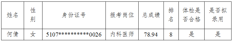 成都市龙泉驿区中医医院关于2021年上半年面向社会公开招聘编外工作人员递补名单的公示 发布时间:2021-08-25 08:05 本文来源: 院办 分享到: 按照《成都市龙泉驿区中医医院2021年上半年面向社会公开招聘编外工作人员工作方案》规定,因苏晋锋(拟录用编外内科医师)自愿放弃该岗位,按成绩由高到低顺序,何倩(内科医师)顺延为递补人员,体检合格,进入拟录用人员名单,现公示如下:公示期为2021年8月24日-2021年9月1日,如有异议,在公示期内以实名制书面或电话方式反映至纪检监察室或医院组织人事部。纪检监察室联系电话:028-60613047组织人事部联系电话:028-68284923成都市龙泉驿区中医医院2021年8月23日 扫一扫 手机端浏览