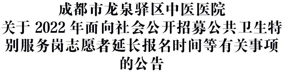 关于2022年面向社会公开招募公共卫生特别服务岗志愿者延长报名时间等有关事项的公告 发布时间:2022-12-03 14:31 本文来源: 组织人事部 分享到: 根据《成都市龙泉驿区中医医院2022年面向社会公开招募公共卫生特别服务岗志愿者的公告》及报名情况,经研究,决定延长报名时间至2022年12月7日17:00。具体面试时间后续将提前在“成都市龙泉驿中医医院”官方网站及微信公众号予以发布,请报考人员随时关注变化情况并做好相应安排。因报考者不主动、不按要求登录相关网站查阅相关信息,导致本人未能按要求参加面试的,责任自负。报名网站:http://qjyy.baomingpingtai.com,具体报名程序请登录报名网站,查看报名流程说明。联系方式:咨询电话:028-68284923 (医院组织人事部)监督电话:028-60652540(医院纪检监察室)官方网站:成都市龙泉驿区中医医院(http://www.lqzyy.com/)微信公众号:成都市龙泉驿区中医医院成都市龙泉驿区中医医院2022年12月2日 扫一扫 手机端浏览