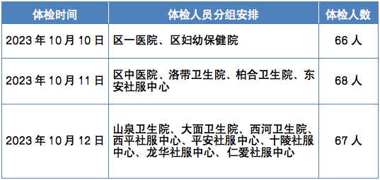 定于2023年10月10日-12日进行体检,体检人员分组安排见下表。请参加体检的考生于体检当天上午8:30前到规定地点集中。考生确因个人原因不能按时参加体检的,须提前联系工作人员另行确定体检时间,未按规定时间参加体检的,视为本人自愿放弃。