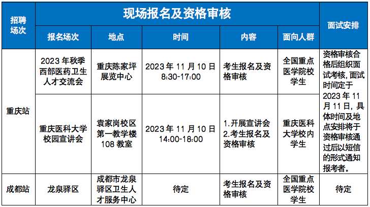 成都经济技术开发区(龙泉驿区)2023-2024年度面向全国重点医学院校公开招聘优秀医卫人才招聘工作将分批开展,首批招聘场地设在重庆(重庆站),现场报名及面试等有关事项已于2023年10月24日通过官方途径(成都市龙泉驿区人民政府-区卫健局官方网站及健康龙泉驿微信公众号)发布;后续招聘场地设在成都(成都站),报名及面试等有关事项将于重庆站招聘结束后通过官方途径发布。相关安排详见下表:
