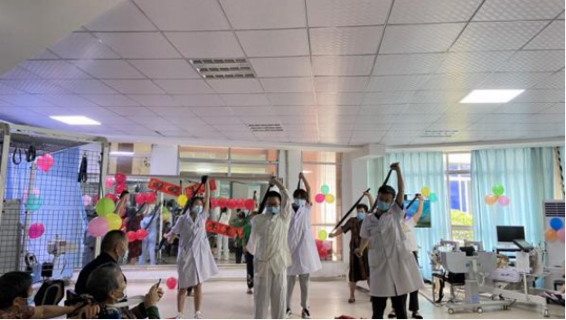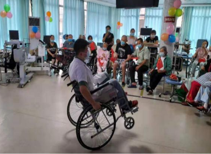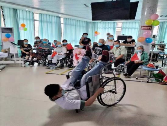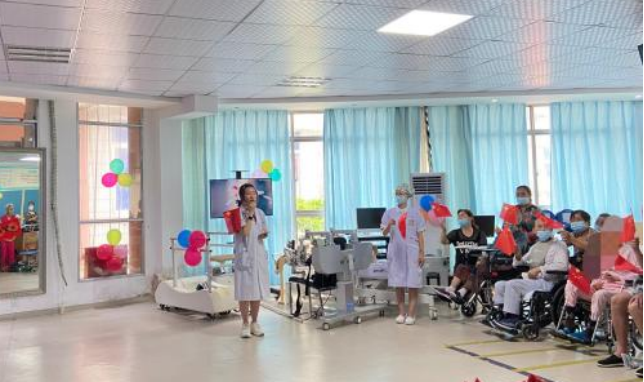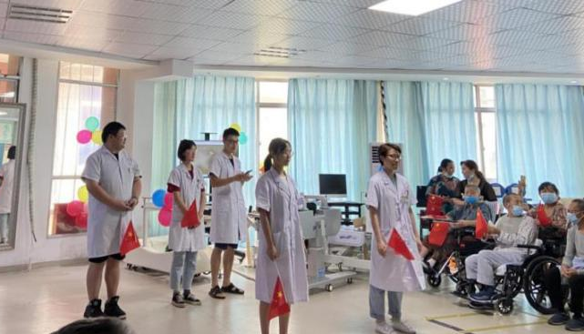 庆祝活动分三个部分:一康复课堂展示,康复医学科医生、治疗师展演传统功法《八段锦》、颈肩操和轮椅使用技巧,让患者及其家属收获康复知识、树立战胜病魔的信心、早日康复、回归社会;二爱党爱国知识抢答,主持人说出题目及选项,患者及其家属抢答,此环节大家踊跃参与,争先表达对党和国家深切的热爱;三爱党爱国节目表演,科室患者、实习生、医护技全体人员分别带来精彩的表演,有舞蹈、歌曲、诗歌朗诵等。