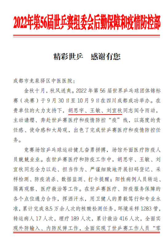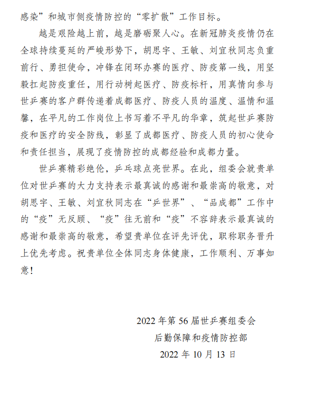 信中提到“在贵单位的大力支持下,胡思宇、王敏、刘宜秋同志闻令而动,主动请缨、奔赴世乒赛医疗和疫情防控“疫”线,以高度的责任感、使命感和大局观,出色完成了世乒赛医疗保障和疫情防控任务。在此,组委会就贵单位对世乒赛的大力支持表示最真诚的感谢和最崇高的敬意,对胡思宇、王敏、刘宜秋同志在“乒世界”、“品成都”工作中的“疫”无反顾、“疫”往无前和“疫”不容辞表示最真诚的感谢和最崇高的敬意!”