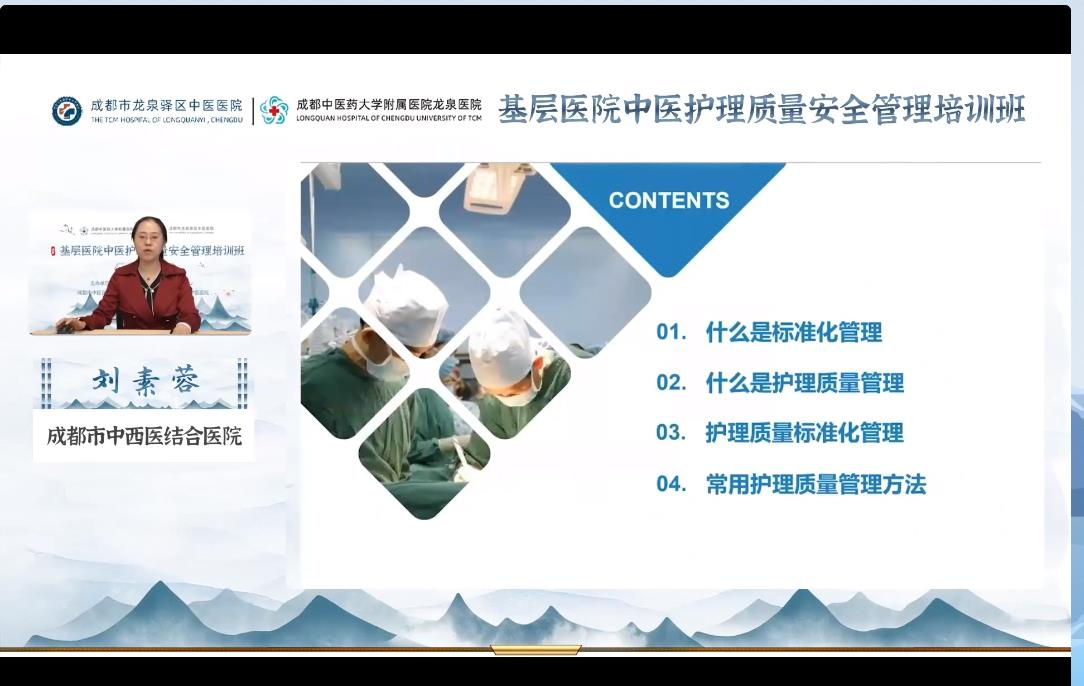成都市中西医结合医院护理部主任刘素蓉主任讲授护理质量管理标准化体系建设,内容丰富,重点明确,适用性强。