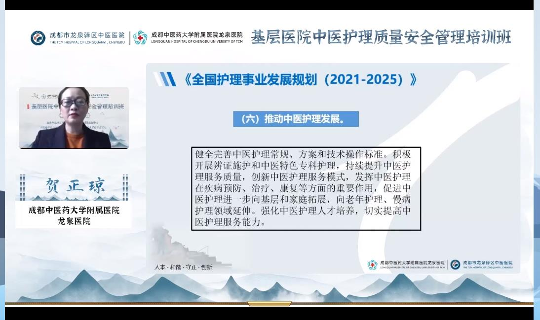 为进一步增强基层医院中医服务能力建设,提升基层中医护理服务水平,加强中医护理质量安全管理,为患者提供更优质更安全的中医护理服务,我院于2022年10月15日举办了线上成都市市级医学继续教育项目暨龙泉驿区中医护理质控中心学术会议,本次会议邀请了成都中医药大学附属医院、成都市中西医结合医院及成都市龙泉驿区中医医院的护理专家进行授课。