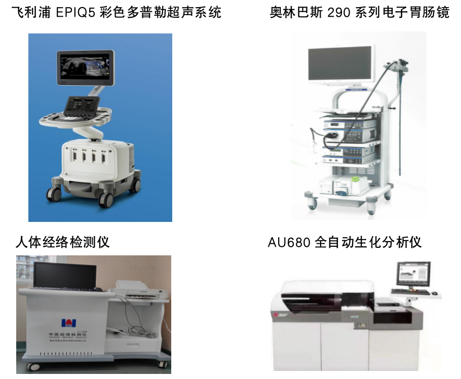 中心拥有UMR586优享磁共振、西门子双源64排CT、奥林巴斯数字胃肠镜、数字化X射线摄影系统、飞利浦EPIQ5全数字思维彩色多普勒超声系统、颅脑多普勒、肺功能检测仪、动脉硬化检测仪、全自动生化分析仪、荧光免疫测定仪、骨质疏松检测仪、全身红外线热成像仪、人体成分分析仪、人体经络检测仪、中医四诊仪等大型检查检验设备,能满足各类人群的体检要求。