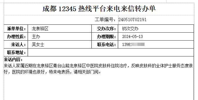 5月13日,我院接到成都12345热线平台来电来信,吴女士在我院皮肤科住院治疗期间感受十分良好,特拨打12345热线表达了赞扬与感谢。