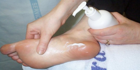 使用皮肤护理膏或霜,适当按摩足部,注意不要将护理膏或霜涂抹于足趾间或溃疡伤口上。严重的足跟皲裂,可以使用含尿素的特殊皲裂霜。