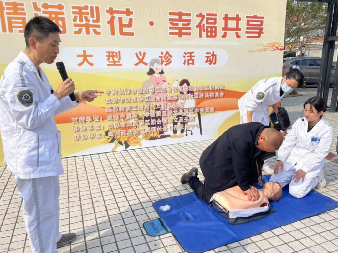 急诊科团队针对急性胸痛的识别、危重症判断、心肺复苏操作等急救技能进行了宣讲,并邀请社区居民一起互动参与,让大家能在危急时刻,该“出手”时就“出手”。