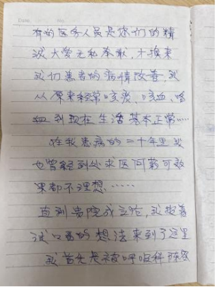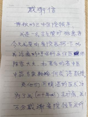 为了表达感激之情,王女士带上锦旗和感谢信,特地前来感谢何成诗主任中医师和陈容副主任中医师。她说:“是他们的精湛医术、精诚大爱和无私奉献,才换来了我今天的正常生活。我被陈容副主任中医师为患者治病的认真态度所吸引,被何成诗主任中医师的巧方所折服。他们不仅解除了我困扰多年的疾苦,还让我少花了冤枉钱,就能把病治好。他们的医术和医德值得被更多患者看到!”