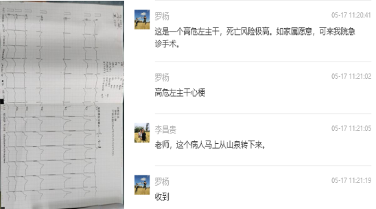 我院心内科副主任罗阳查看信息后,立即明确指出:患者所患疾病考虑为高危左主干心梗,此类病情具有极高的死亡风险。罗主任强烈建议,在取得患者家属同意的前提下,应尽快将其转诊至我院进行急诊手术。
