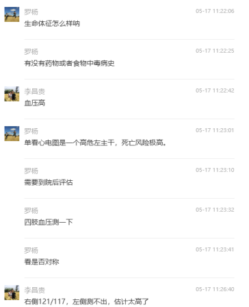山泉镇公立卫生院医生迅速与家属进行沟通取得同意后立即启动转诊程序。在转诊过程中,罗主任持续在群内询问患者病史、症状及生命体征等详细信息以进一步明确病情。