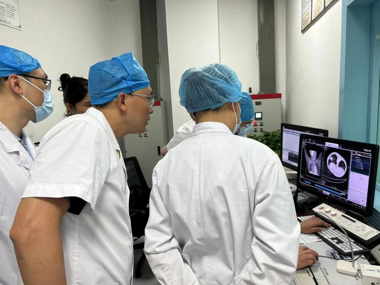 患者,男,78岁,近期因右侧肺部占位性病变在洪安镇公立卫生院就诊,由于病情较重,患者和家属选择信任的中医院,通过医联体双向转诊绿色通道迅速转入我院老年病科。经过科室团队的全面评估和深入讨论,在与患者及其家属积极沟通并取得同意后,科室决定为患者实施经皮肺穿刺活检术,以明确占位的性质,为后续治疗提供科学依据。