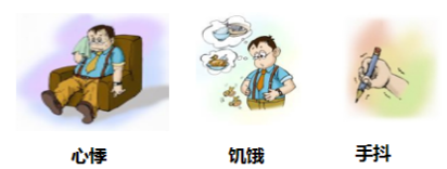 通常会有饥饿感,还会出现心慌、手抖、头昏、眼花、乏力、冒冷汗、面色苍白,严重者还可出现昏迷、心脑血管意外等,甚至危及生命。