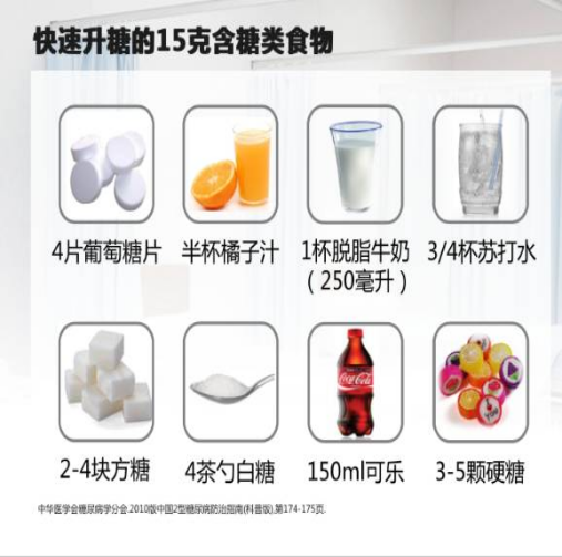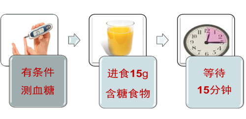 意识清醒的病人,立即进食15克含糖食物(如糖水、含糖饮料,或饼干、面包、馒头等),15分钟后测血糖一次。
