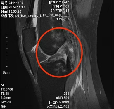 ▲术前核磁共振提示膝关节前、后交叉韧带断裂,内侧副韧带损伤