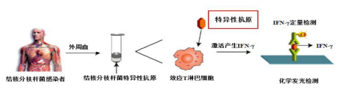 结核γ-干扰素体外释放试验(TB IGRA)是指实验室检测并定量分析由结核分枝杆菌体外刺激效应T细胞产生的γ-干扰素的浓度,判断是否存在结核分枝杆菌特异性细胞免疫反应,进而判断患者结核分支杆菌感染情况的试验。