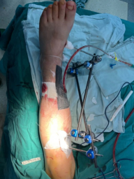 同时,我院骨伤科一科主治医师张波在患者到达前,已做好急诊手术相关准备,为患者提前开放创伤急救绿色通道。张波医生为患者讲解道,开放性骨折受伤后6~8小时内进行手术,能减少后期感染、坏死的风险,但由于患者目前骨折处广泛的软组织损伤,且污染严重,建议先行清创负压吸引+下肢动脉探查+骨折外固定手术,等待软组织修复,择期更换为内固定手术。