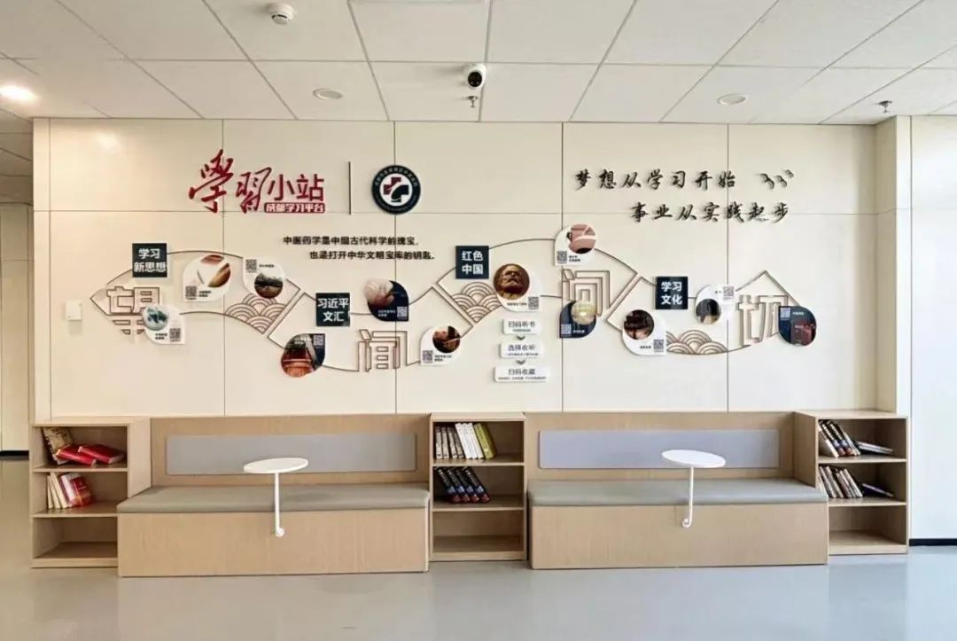 在门诊大厅公共空间打造200余平米集咖啡轻食、中药茶饮、阅读书吧、休闲卡座为一体的“学习小站”,为患者、职工提供中西融合、温馨舒适的“家空间”。