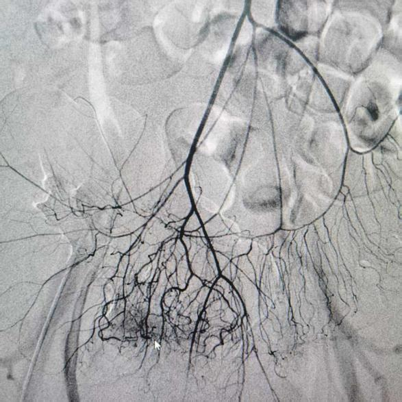 入院后检查显示,大肠及小肠末端肠腔存在大量暗红色血液及血凝块,此时患者血压已降至84/47mmHg、血红蛋白降至 69g/L,考虑持续活动性小肠出血伴失血性休克。在快速补液、止血输血的同时,消化内科连夜联系介入中心行急诊腹腔动脉造影及栓塞治疗。